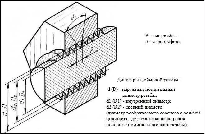 Нормативным документом, в котором оговариваются требования к размерам цилиндрической дюймовой резьбы, является ГОСТ 6111-52. Как и любая другая, дюймовая резьба характеризуется двумя основными параметрами: шагом и диаметром. Под последним обычно подразумевают: