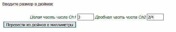 Данные для расчёта вводите в след. порядке: щёлкните левой кнопкой мышки в окне соответствующего параметра для появления мерцающего курсора; введите Ваши цифры. Дробная часть дюйма вводится без знака.