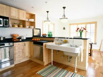 Это старомодно и отвратительно. Лучше повесьте между окнами какие-то картины и шкафчики, чем закрывать эту стену полностью. Также, очень рекомендуем вам поставить у окна мойку. В частном доме это смотрится просто замечательно и уместно, в отличии от квартир.
