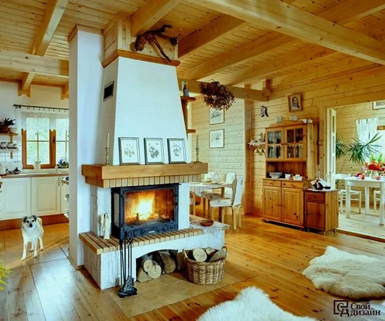 Поэтому, рассчитывайте её расположение с тем учётом, чтобы она не оказалась рядом с обеденной зоной. Кроме духоты, вам неудобно будет к ней подходить из-за мебели и подбрасывать дрова.
