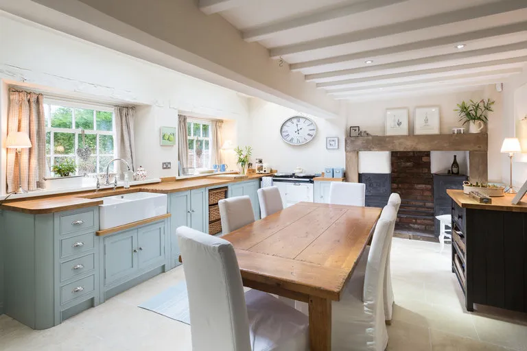 Нет ничего уютней, чем кухня в стиле усадьбы. Тут вам нужен не только буфет, но и письменное бюро и прочие элементы, которые присутствовали в барских усадьбах. Обязательно поставьте кресло у камина. Впрочем, лучше посмотрите на подборку фото:
