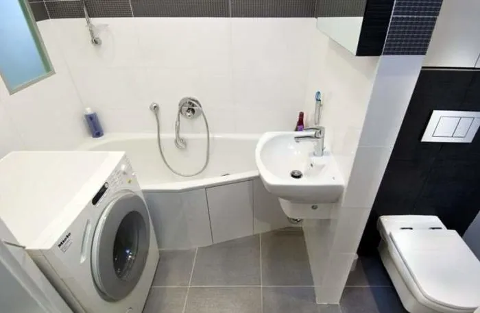 Недостатком считается то, что здесь не остается места для стиральной машинки, что, однако, легко решается ее размещением под раковиной. Вариант удобен тем, что отпадает необходимость перепланировки всего санузла.