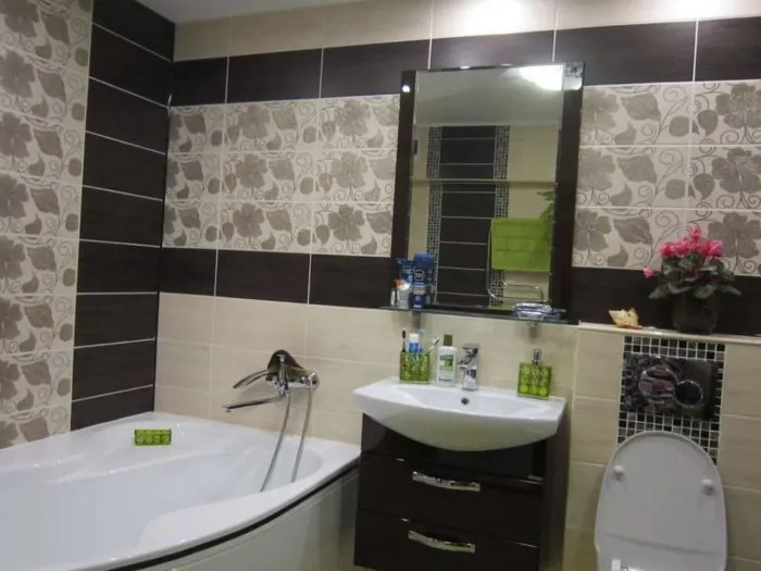 Создавать на стенах ванной комнаты комбинации из всевозможной плитки – это неудачная затея. Такие решения подходят исключительно для больших санузлов, но никак не для хрущевок.