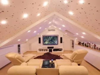 Можно организовать пространство, сделав его развлекательным. К примеру, обустройства домашнего кинотеатра – прекрасная идея, позволяющая сэкономить на монтаже окон. К слову, мансардные окна – удовольствие недешевое.