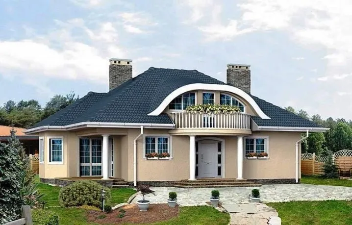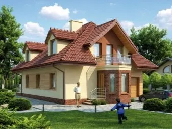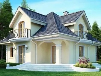 Красиво смотрится мансарда под крышей сложной конструкции. В данном случае она дополнена балконом, который держится на колоннах. Он одновременно выполняет роль козырька над крыльцом.