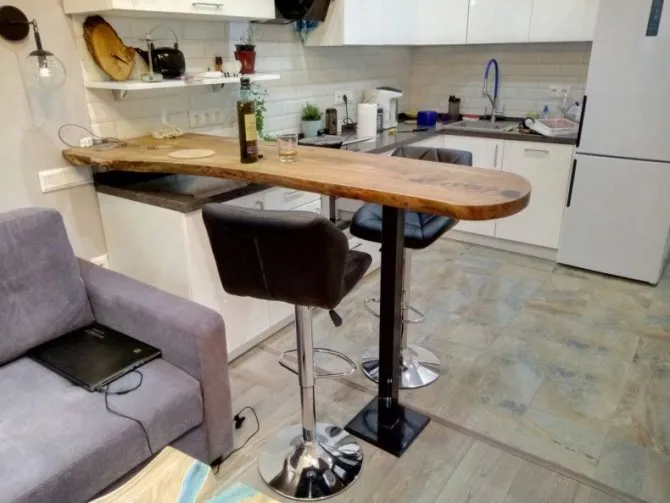 - В квартире-студии барная стойка помогает разграничить пространство. Специалисты советуют выбрать Г-образную модель или пристенную, примыкающую к стене узкой частью.