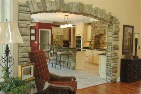 Чаще всего, в виде арок оформляется проем на входе в помещение из коридора или гостиной, если была проведена перепланировка, и кухонное помещение было объединено с комнатой.