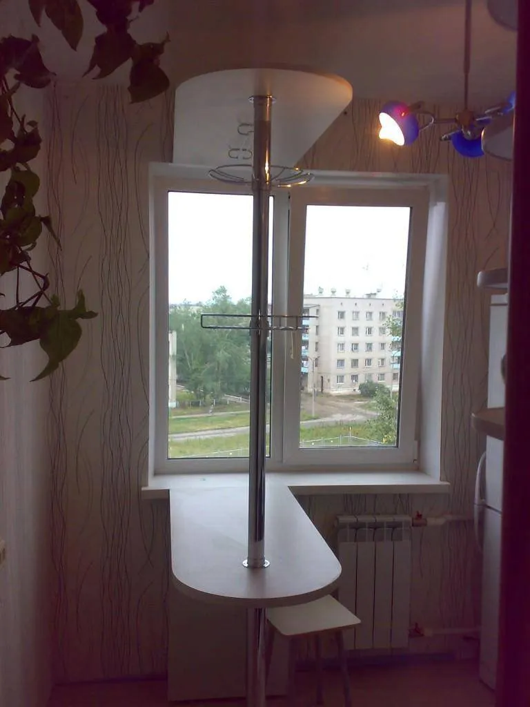 Подоконник в роли барной стойки – популярное решение для небольшой кухни