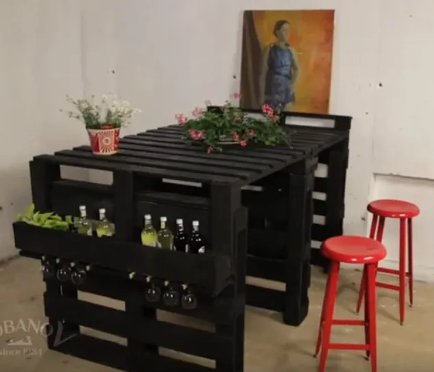 Стиль лофт с благодарностью откликнется на стойку из паллет. Красивый узор волокон дерева, необычный и экспрессивный вид в вашем интерьере запомнится гостям надолго.