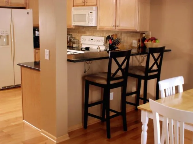 - Для узких и вытянутых кухонь подойдет барная стойка, прикрепленная к стене при помощи металлических кронштейнов. Столешницу можно расположить на любой высоте и сделать любой длины и ширины. В интерьере кухни небольшого размера, фото дизайн которой можно посмотреть на сайте, такое изобретение станет настоящей находкой. Примечательно, что такая мини-барная стойка может быть складной и в сложенном виде вплотную примыкать к стене, не занимая места.