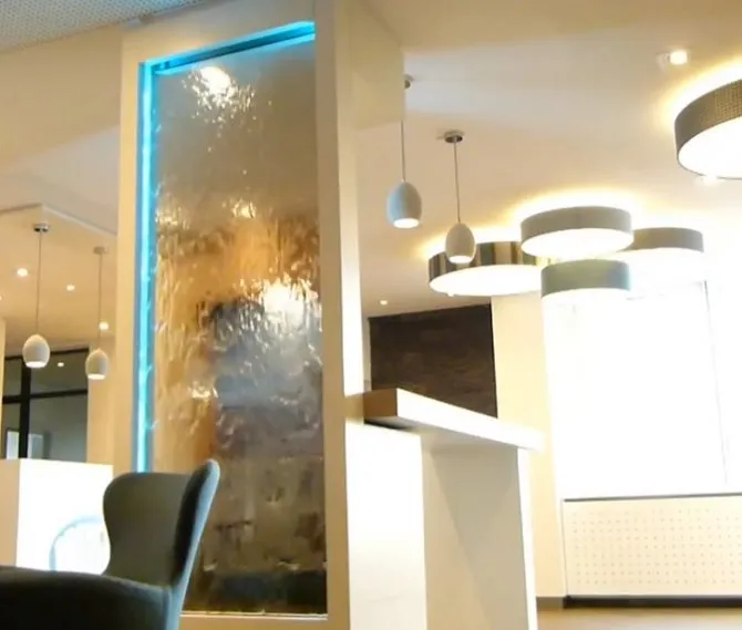 Наблюдать, как струится вода по стеклу — успокаивающее и приятное зрелище. Декорирование интерьера при помощи водопада пользуется большой популярностью в различных типах помещений. Такой дизайн подойдет для квартир, офисов, отелей, супермаркетов, торговых центров и других мест. В зимний и летний периоды воздух в помещении становится слишком сухим, что негативно влияет на здоровье людей, находящихся в таком помещении.