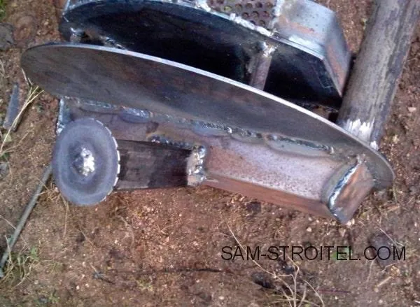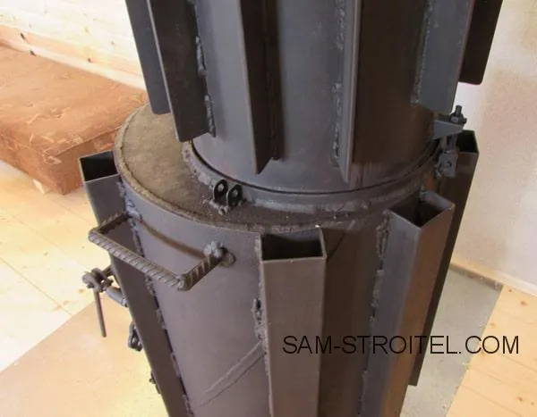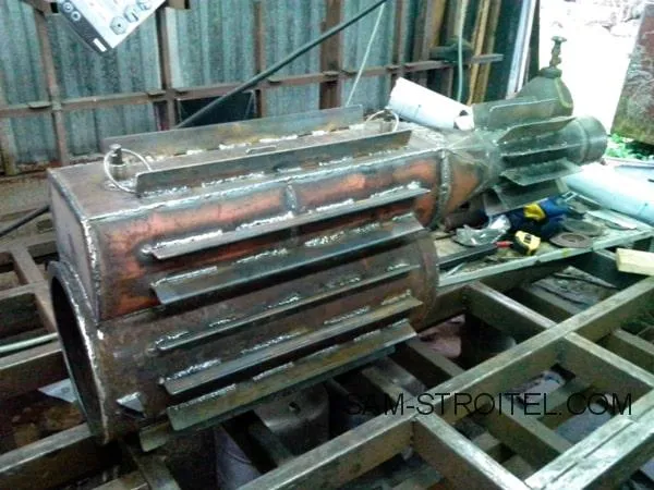 Из профильной трубы 60х40, навариваются четыре ноги и еще два колодца-воздухонагревателя. Ноги тоже работают как воздухонагреватели, для этого в самом низу каждой ноги сделаны вырезы для забора воздуха от самого пола.