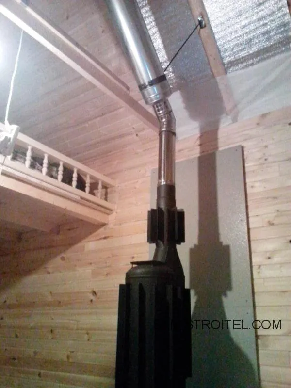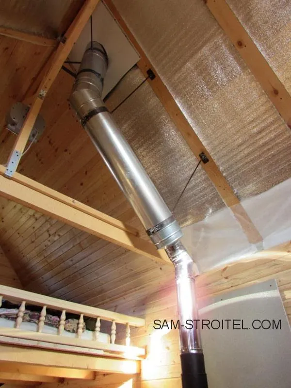Сопряжение с дымоходом. Пол метра простой трубы, а потом угол, и дальше сэндвич до самого верха.