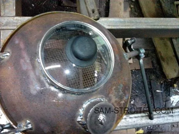 На дверце будет стеклянное окошко, из крышки от маленькой сковородки. И регулятор воздуха малых расходов, для экономичного режима горения.