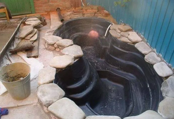 Чтобы сделать основательное сооружение, нужно обустроить специальную чашу для скопления воды и место для хранения гидротехнической системы. Дно котлована выстилают пленкой либо выбирают подходящего объема емкость.