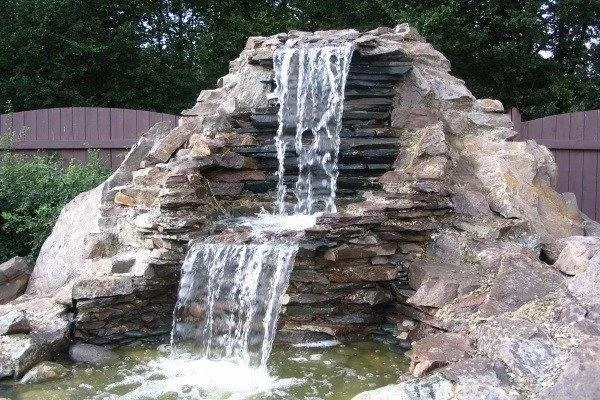 В отличие от пристенных фонтанов, высота таких конструкций может быть больше. Обычно такой водопад на даче располагают рядом с альпийской горкой. Вода подаётся насосом в верхнюю точку и стекает вниз по камням или другим декоративным элементам каскадом.