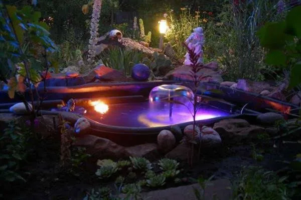 Для оформления фонтана на даче можно использовать различные растения, цветы, камни, фигурки из глины и многим другим по вашему усмотрению. Также, очень красиво смотрится садовый фонтан для дачи с подсветкой. Для этого поищите в магазинах лампочки, светильники, светодиодные ленты, фонари для воды.