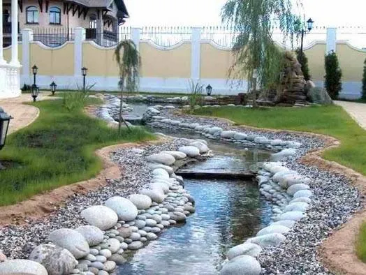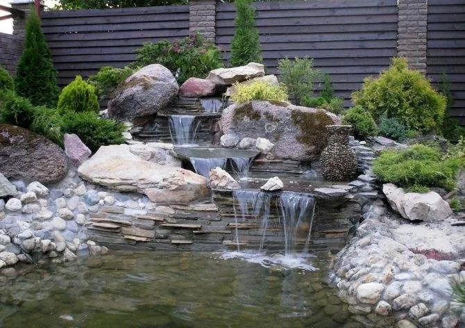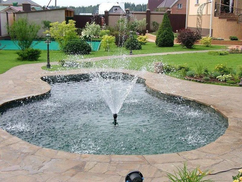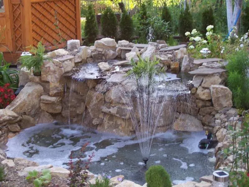 Основой выступает присутствующий на дачном участке водоем. Движение воде придает насос, благодаря которому она поступает в трубу, оборудованную насадками, формирующими форму и направление струи.