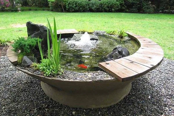 Самое очевидное решение — небольшой садовый пруд из поливинилхлорида. Эти изделия производятся любой формы и размера; типичный цвет внутренней поверхности — черный. Пруд может быть постоянной высоты или ступенчатым.