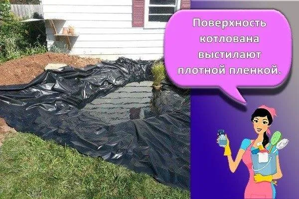- Поверхность котлована выстилают плотной пленкой которая не допустит выхода воды из чаши.