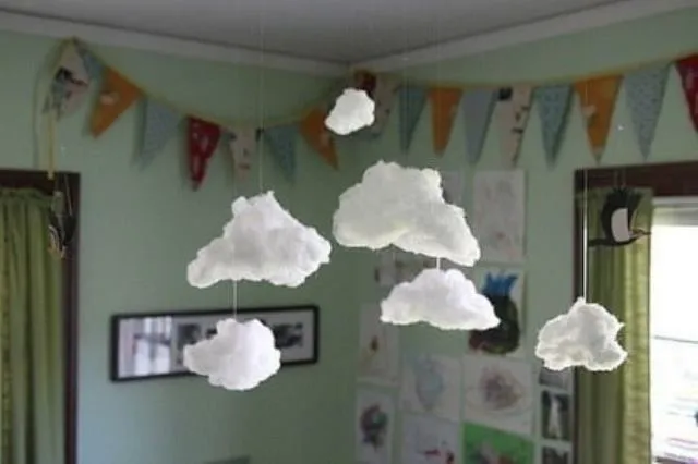 Еще один несложный способ украсить комнату – создать множество небольших ватных облаков. Для этого понадобится достаточно много ваты и ей следует запастись заранее. Изготовление декор будет несложным: из ваты создается комок, по форме напоминающий облако и сквозь него продевается тонкая леска. Когда все будет подвешено к потолку, леску будет почти не видно и будет создаваться ощущение, что ватные облака парят сами по себе.