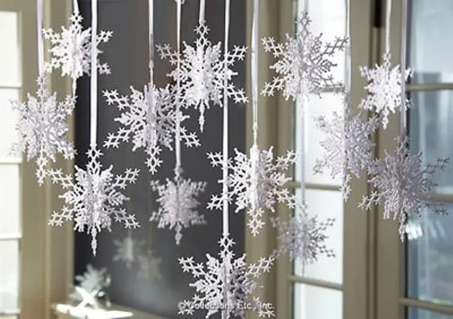 Снежинки — можно сделать из бумаги, фольги или других материалов. Снежинки можно нанизать на нитку и повесить на окно или на елку.
