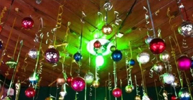 Такие композиции сделать немного сложнее, но и выглядят они гораздо привлекательнее. Придется подключить немного фантазии, чтобы такое новогоднее оформление потолка, выполненное своими руками, выглядело красиво и необычно. Ленты подбираются разной длины и на концах закрепляются елочные шары разных цветов и размеров. Свободные концы лент скрепляются вместе и вся конструкция подвешивается на люстру или прикрепляется к потолку.