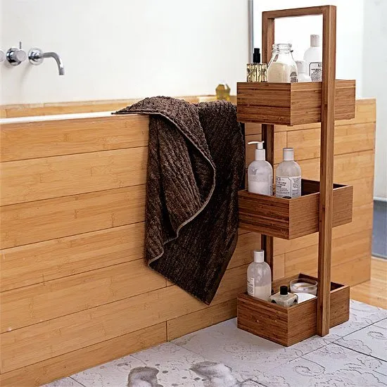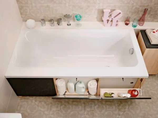 Вот еще один вариант, экономящий пространство — экран под ванну с полочками и ящиками. Такая потайная конструкция способна не только освободить захламленное пространство, но и организовать с умом бытовую химию, косметику и другие ванные принадлежности.