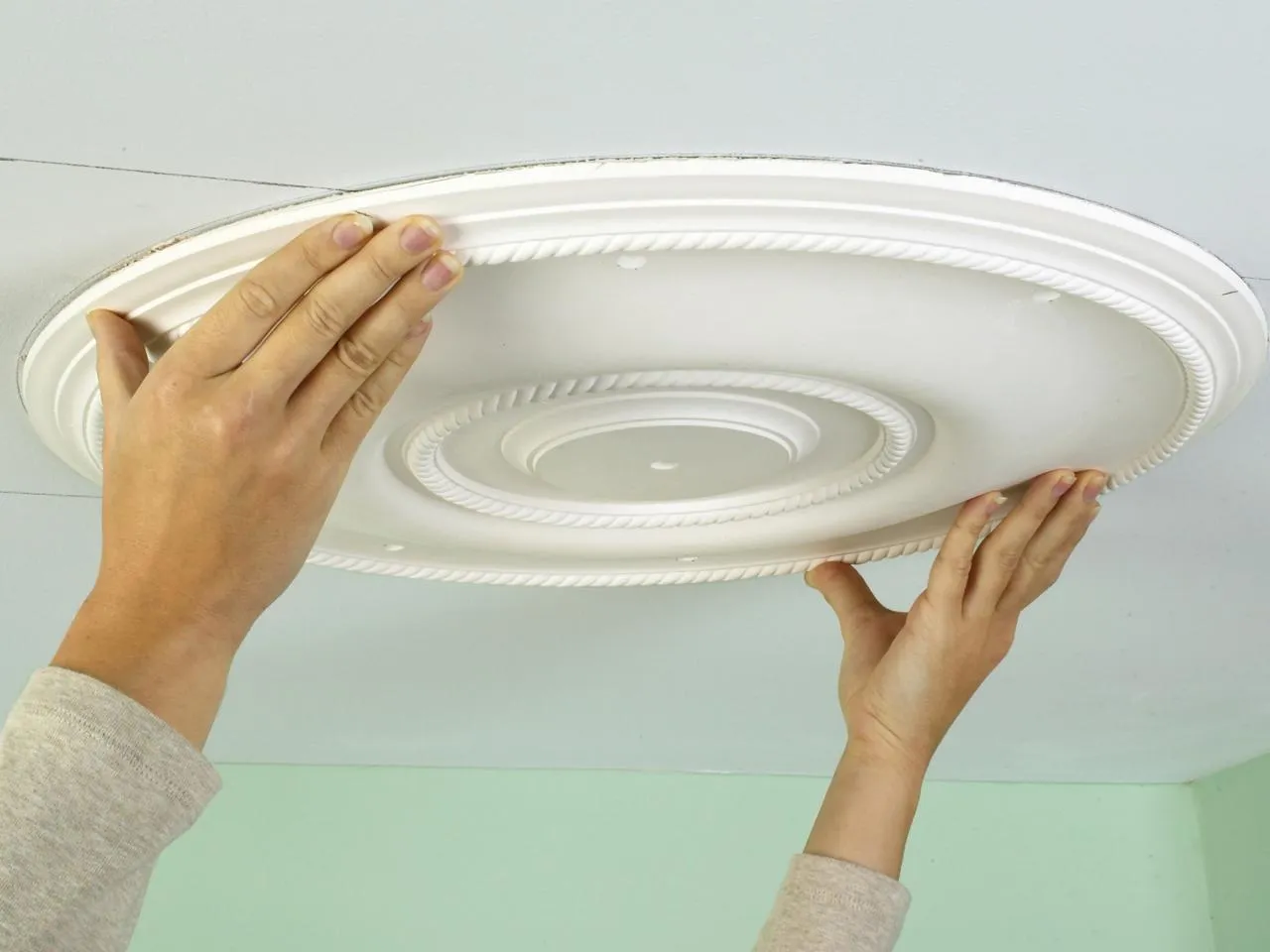 Потолочные розетки, выполненные из пенополиуретана, крепят к основанию на клей. Для работы используют «жидкие гвозди» или специальный клей, созданный для лепнины из пенополиуретана. Сам потолок в месте установки розетки покрывают слоем грунтовки глубокого проникновения.