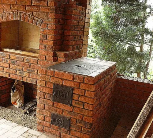 Сооружать печь на улице следует с подготовки основания и создания фундамента. Для этих целей используется битый кирпич и цементный раствор. Кладка печи выполняется в соотношении с ранее подготовленной схемой и порядовкой. От качества кладочного состава напрямую зависит качество функционирования печи, поэтому данному вопросу нужно уделить особое внимание.