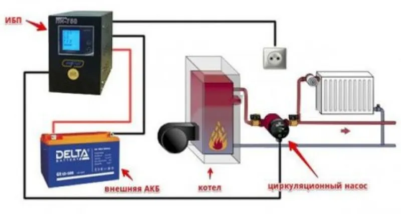 Отдельно хотелось бы рассмотреть такой вариант монтажа, как подключение насоса к ИБП. Он наиболее предпочтителен и обеспечивает независимость функционирования системы отопления от перебоев в подаче электроэнергии. Схема подключения циркуляционного насоса к источнику бесперебойного питания предоставлена ниже: