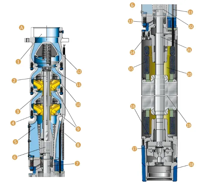 Устройство штангового погружного насоса. А — насосная часть: 1 — выходной патрубок; 2 — вал насоса; 3 — компенсационное кольцо; 4 — уплотнительное кольцо; 5 — всасывающая камера; 6 — шлицевая муфта; 7 — вал двигателя; 8 — защитная сетка; 9 — рабочее колесо; 10 — подшипник рабочего колеса; 11 — проточный канал; 12 — обратный клапан. Б — двигатель: 13 — канал для отвода песка; 14 — уплотнение; 15 — обмотка статора; 16 — подшипник для снятия осевой нагрузки; 17 — упорный подшипник; 18 — система выравнивания давления; 19 — ротор; 20 — смазка; 21 — вал насоса; 22 — муфта; 23 — сетевой кабель