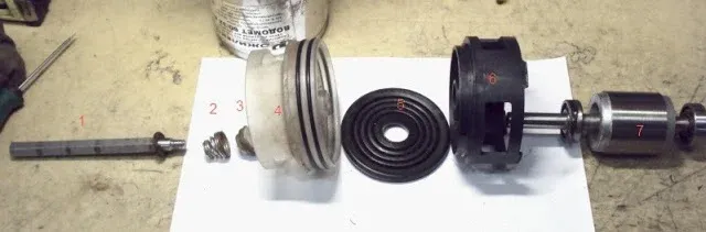 На фото изображены элементы разобранного двигателя насоса «Водемет»: 1 — вал гидравлической части; 2 — пружина сальника, 3 — сальник, 4 — передняя крышка; 5 — мембрана; 6 — передний фланец; 7 — ротор