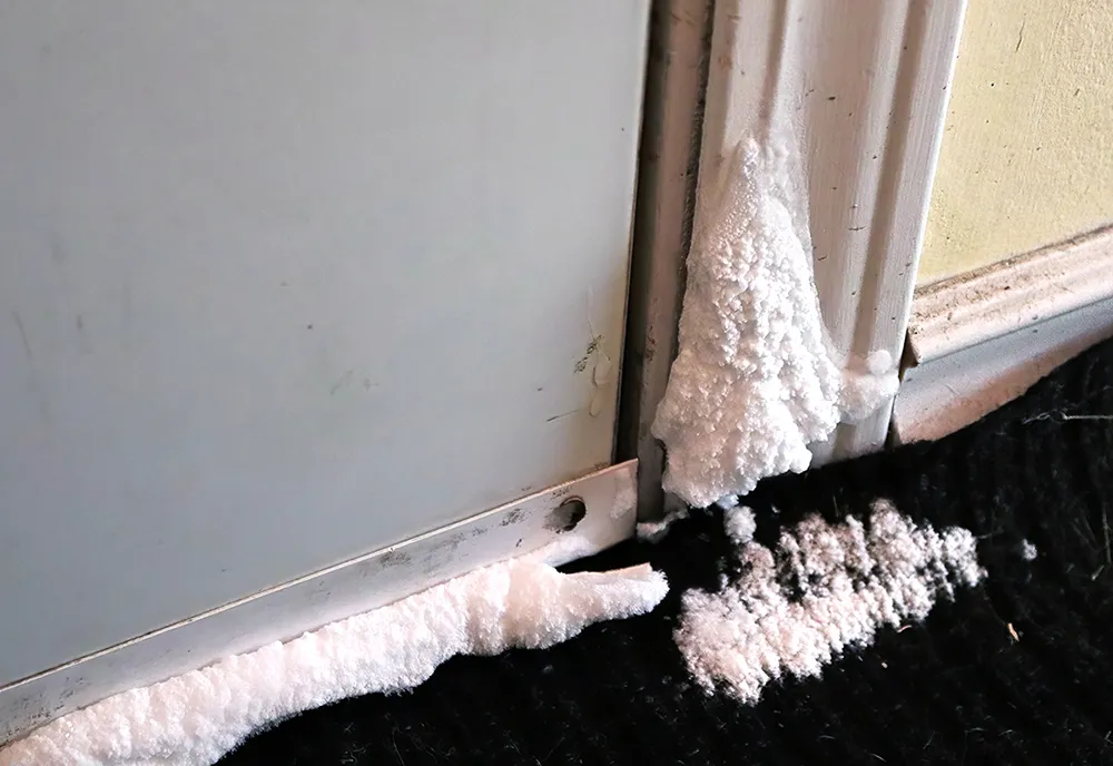 Однако каким бы хорошим ни был утеплитель, при сильных морозах дверь все равно промерзает, а при потеплении — течет. Снаружи металлическая рама двери (рама — то же самое, что коробка) охлаждается до минусовой температуры, а рама внутри дома остается теплой. Из-за перепада температур на двери появляется конденсат. Если на улице не слишком холодно, то дверь буквально начинает течь, а в заморозки превращается в лед. Это портит декоративную отделку: шпон или ПВХ-панели могут отклеиться. Кроме того, это сказывается на открывании и закрывании дверей: можно выйти из дома, а обратно попасть уже не получится.