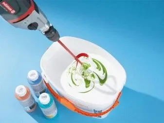 - Поверхностное перемешивание краски не позволит получить однородный цвет. Рекомендуется использовать миксер либо штукатурную насадку для дрели, которые обеспечат тщательное перемешивание. При этом дрель необходимо установить на минимум, чтобы не разбрызгать краску.