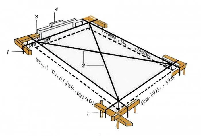 После проведённых работ следует сделать разметку – определить на месте, где и как будет располагаться здание. Проект, созданный в масштабе на бумаге, переноситься на поверхность участка.