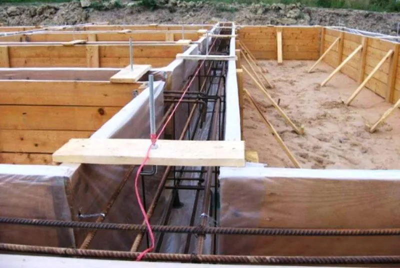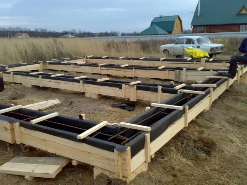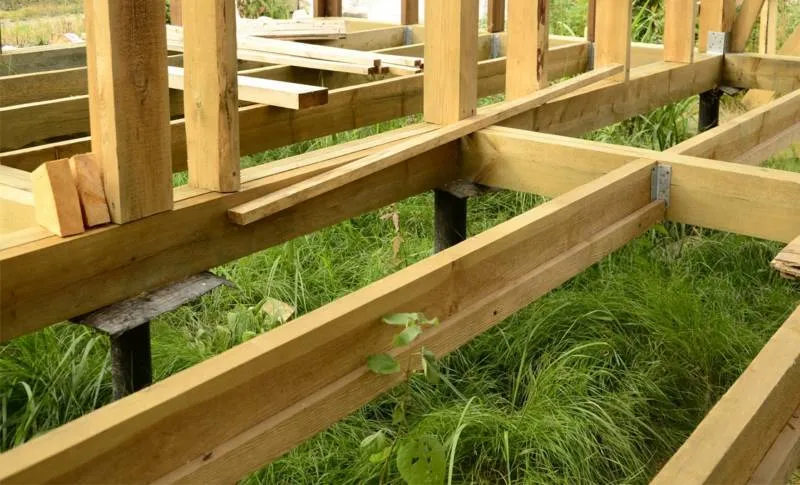 - После этого делают обвязку, она придаёт фундаменту жёсткость и является основой для пола. Её готовят из брусьев, обработанных антисептиком и покрытых мастикой.