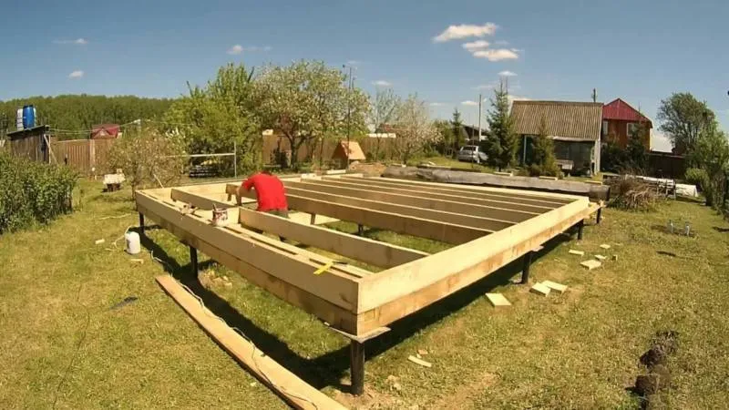 Из материалов понадобятся доски, гвозди, болты, сваи, бетон, фанера, гипсокартон, брусья, утеплитель, рубероид, плиты ОСБ, стальные уголки, трубы, провода.