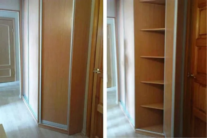 Распашную дверь-купе можно поставить на угловой проем, надежно закрывая ниши такой формы. С этим может быть связана и серьезная проблема, ширину двери заблаговременно рассчитать будет сложно.