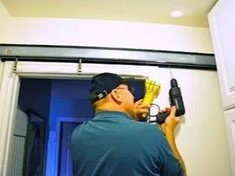 Монтаж навесной двери начинают, приставляя полотно, при этом маркером проводят прямую линию, обозначающую верх двери; ровно в семи сантиметрах выше проводят еще одну прямую. К ней прикладывают брусок, закрепляя его анкерами так, чтобы половина находилась выше проема, а другая половина — в направлении открытия полотна. Внимательно следите, чтобы брусок шел горизонтально, в противном случае пользоваться дверью будет неудобно.