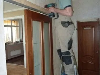 Инструкции по сборке дверей купе важно учитывать в любом случае, но есть моменты, которые требуется принимать во внимание, независимо от конструкции. В большинстве вариантов нижние направляющие вдвое превосходят по длине ширину проема, на одном конце они длиннее, чем проем, где-то на 50-70 миллиметров. Если не можете понять, где крепить верхнюю направляющую, навесьте на дверь ролики и установите их на нижней.
