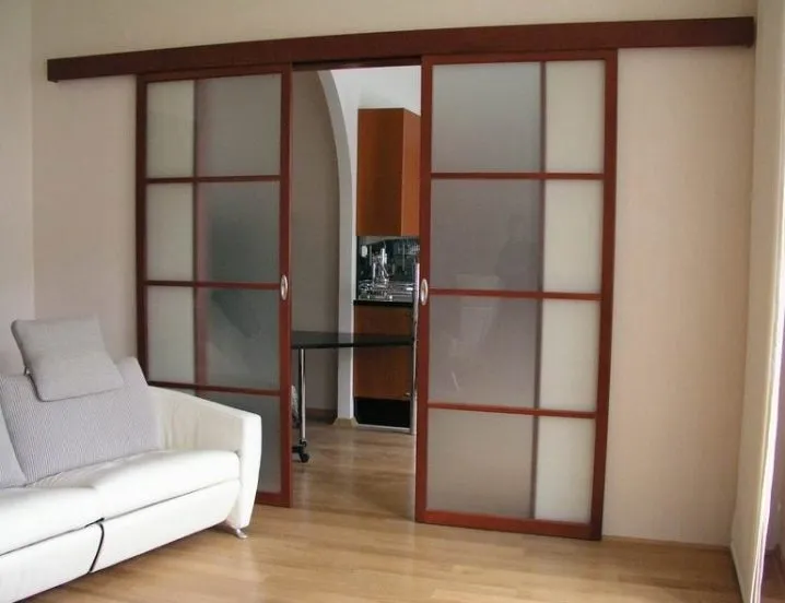 Разделить на части одну комнату можно сложносоставной дверью, одна из створок которой неподвижна, а вторая — купированная; есть и другие варианты. В любом случае будет два этапа: сначала монтируют профиль, в который уже и помещается полотно. Модели эконом-класса делают из ДСП либо МДФ, а в конструкциях более высокой ценовой категории применяются натуральное дерево и стекло повышенной прочности.
