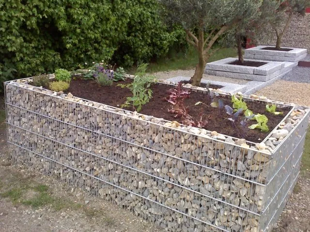 Если у вас на участке очень много камней, вы сильны и располагаете массой свободного времени, можно соорудить часто встречаемую на городских улицах конструкцию из габионов. Металлическая снова для них продается в строительных и садовых гипермаркетах, а вот наполнение придется добывать самостоятельно. Конечно, такие гряды создаются на века, но в этом есть не только плюсы, но и минусы – передвинуть посадку так просто не выйдет.