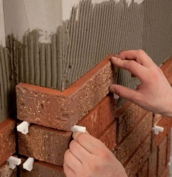 3. Начиная с угла, установить первый фрагмент. Клей наносится на обратную сторону плитки зубчатым шпателем. Остатки смеси при фиксации нужно сразу удалять. Каждый ряд кладки следует проверять уровнем. Соблюдение интервала между плитками осуществляется монтажными крестиками. Их параметры должны соответствовать планируемым швам.4. Последующие ряды выстраиваются по принципу кирпичной кладки.