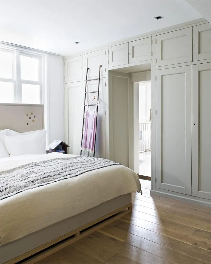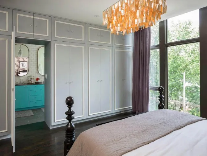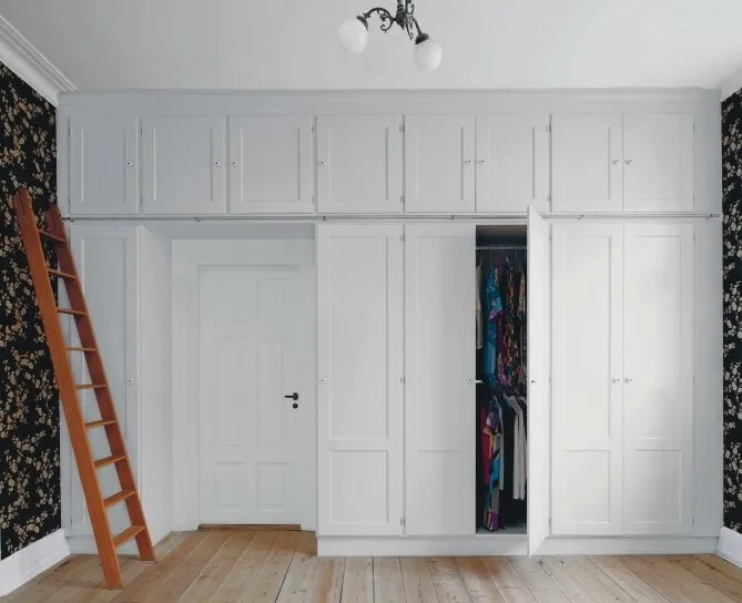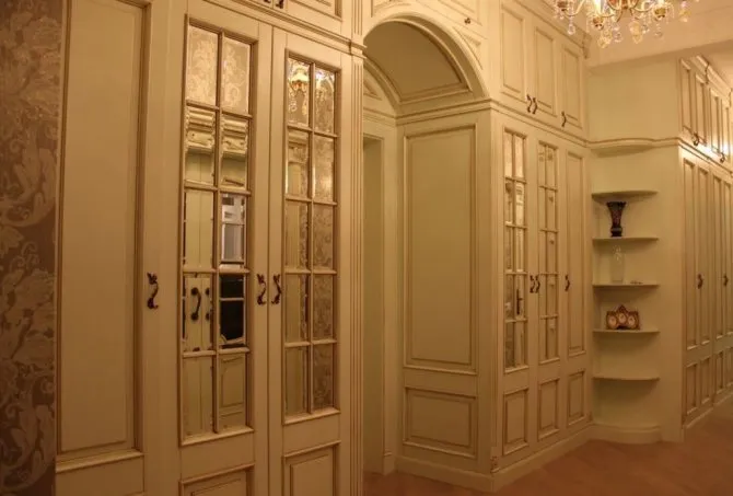 Использовать зеркала. Зеркала могут визуально расширить пространство и скрыть шкаф. Зеркала можно использовать как двери шкафа или установить их на двери встроенного шкафа.