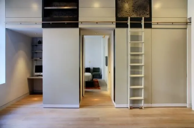 Пространство вокруг двери обычно как-то выпадает из нашего внимания, но именно оно способно решить проблему небольшой комнаты, если оборудовать П-образный шкаф купе с антресолями вокруг дверного проема и раздвижные двери, которые не занимают много места при открывании.