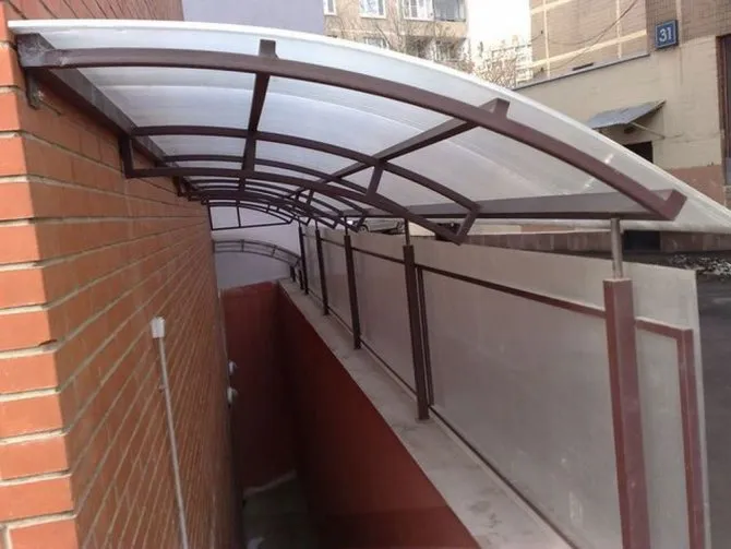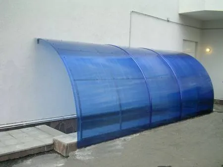 - Козырек над входом в подвал – самая часто встречающаяся система. Она недорога и проста в исполнении – требуется две или более стоек и каркас из древесины либо металла. С появлением поликарбоната устройство козырьков значительно упростилось.