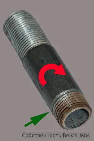 Итак, помолившись, приступаем. При уплотнении резьб льном или тангитом есть небольшие хитрости. Тангит наматывается, что очевидно, на резьбу, которая на трубке находится. Располагаем эту трубку концом, то есть торцом к себе. Получается, мы смотрим прямо на торец, на который будем накручивать что бы там ни было. Прикидываем примерно, сколько резьбы у нас будет использовано. Берем нить тангита и начинаем обматывать. Начинаем этот процесс не от торца, а к торцу, отступив от края на то расстояние, которое будет внутри гайки. На приведенной схеме я указал примерное положение, от которого надо начинать зеленой стрелкой. При наматывании тангита крутим нить по часовой стрелке (красная стрелка на схеме), глядя на торец трубы. Первая петля должна жестко закрепить нить. чтобы она не тянулась и не распускалась. Дальше действуем по инструкции к тангиту, то есть следим за тем, чтобы нить не ложилась внутрь канавок резьбы.