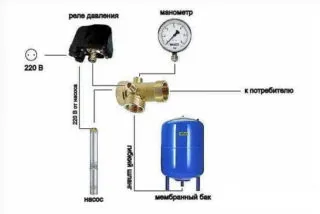 Чтобы уменьшить стоимость комплекта напорного оборудования, можно применить схему подключения скважинного насоса только с реле давления без управляющего блока. Устройство отключает помпу, когда напор достигнет максимума, и запускает ее при уменьшении показателей до минимума.