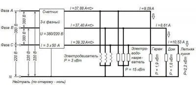 В дом заходит четырехжильный провод на три фазы и нейтраль. Напряжение электрической сети составляет 380/220 В. Между фазами и нулевым проводом подключаются электроприборы на 220 В. Кроме того, может быть еще трехфазная нагрузка.